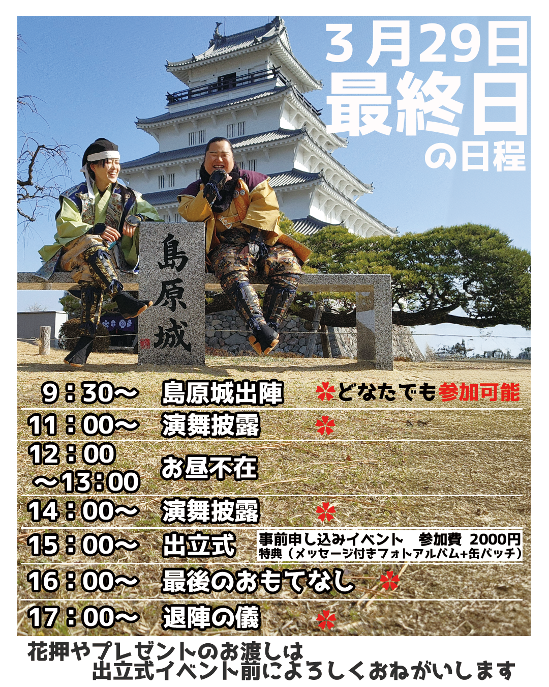 イベント当日をもって活動終了する島原城七万石武将隊の出立イベントです。