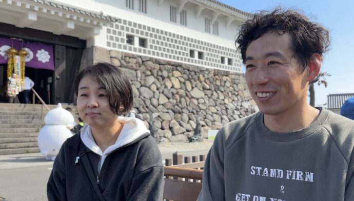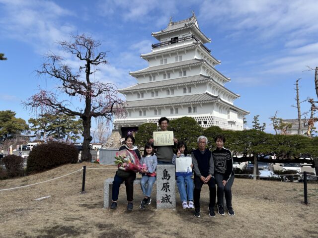 記念すべき100万人目のお客様は、長崎市よりお越しの片江祐樹様ご家族です。島原城へはちょうど10年前にひなめぐりを見に来られたことがあるご家族で、本日は祐樹様のご両親の金婚式で島原半島へご旅行され、お立ち寄りになりました。
